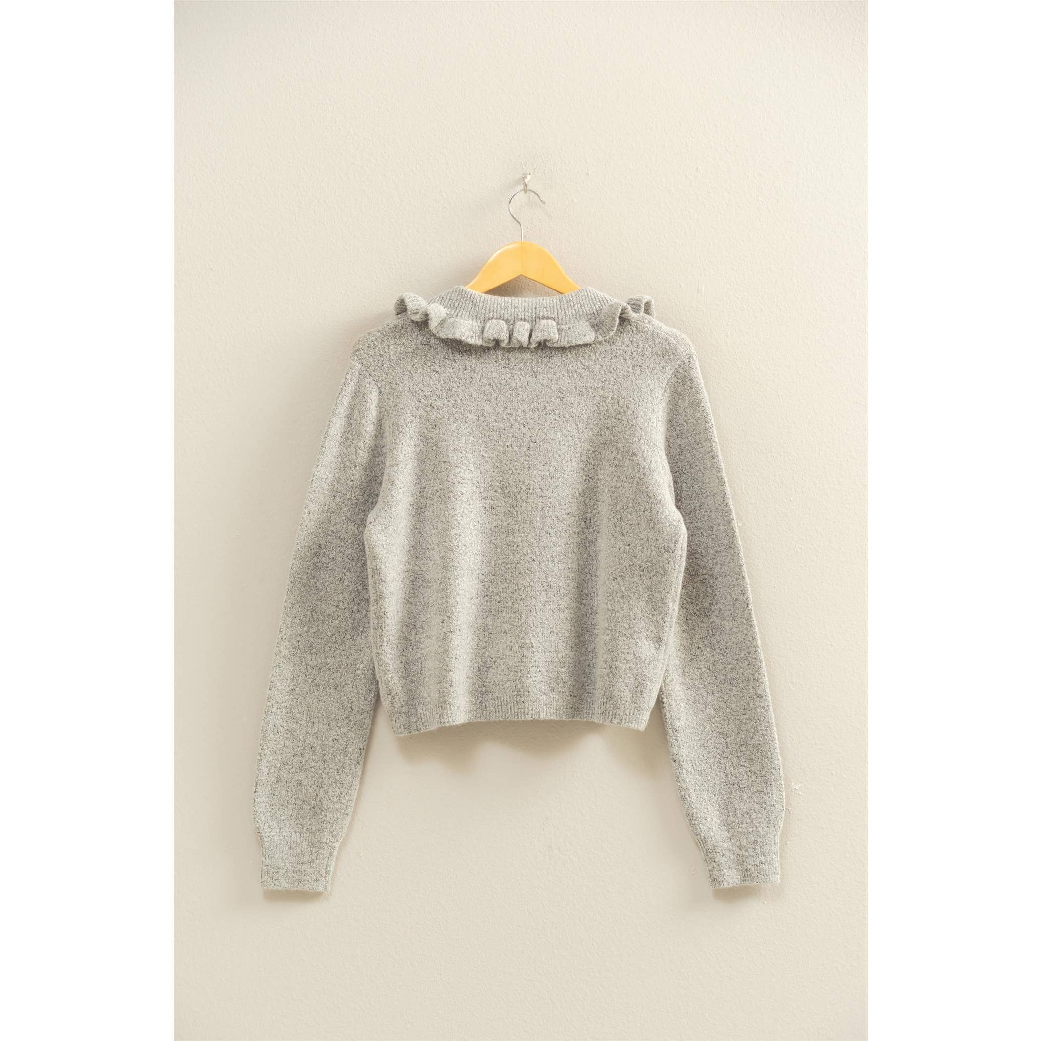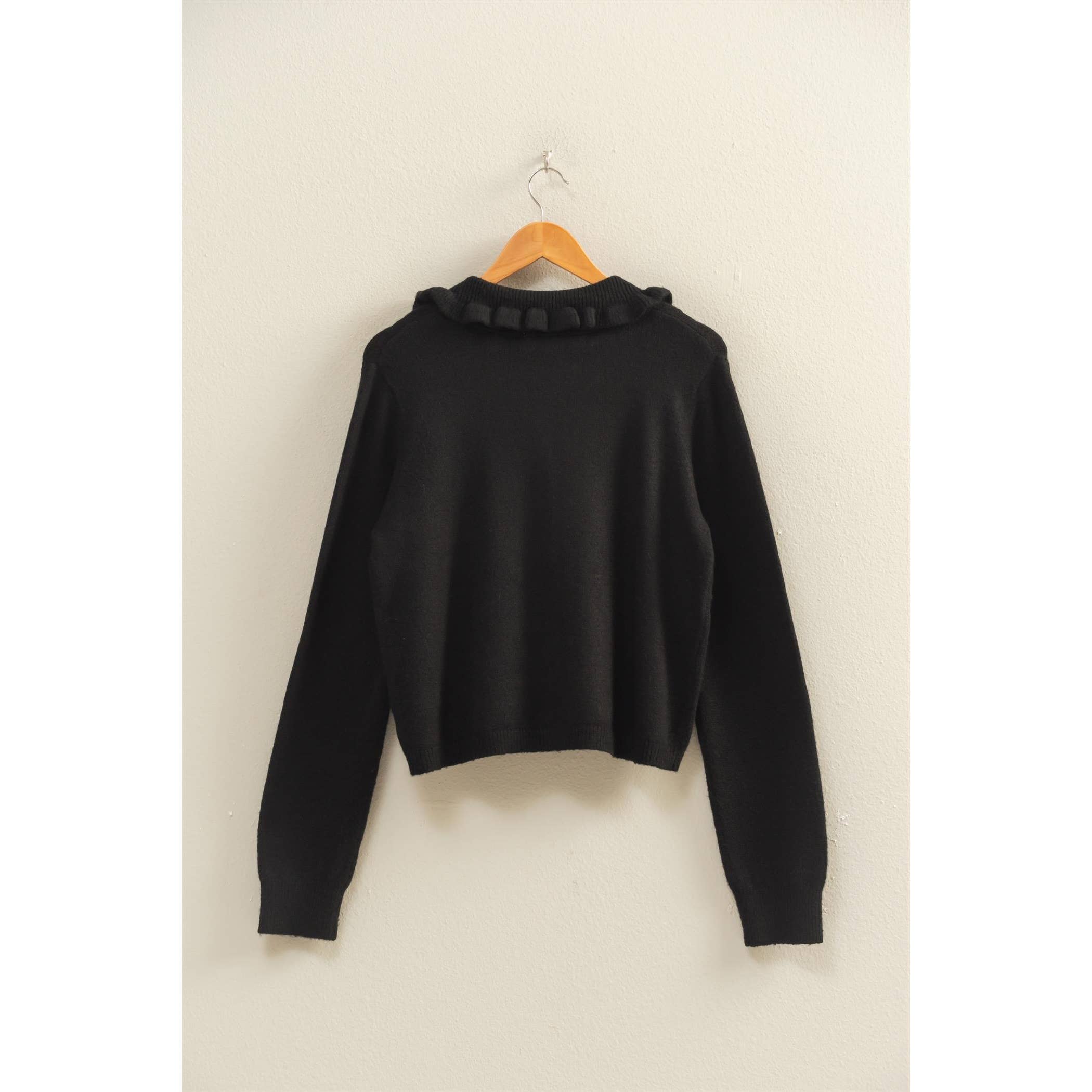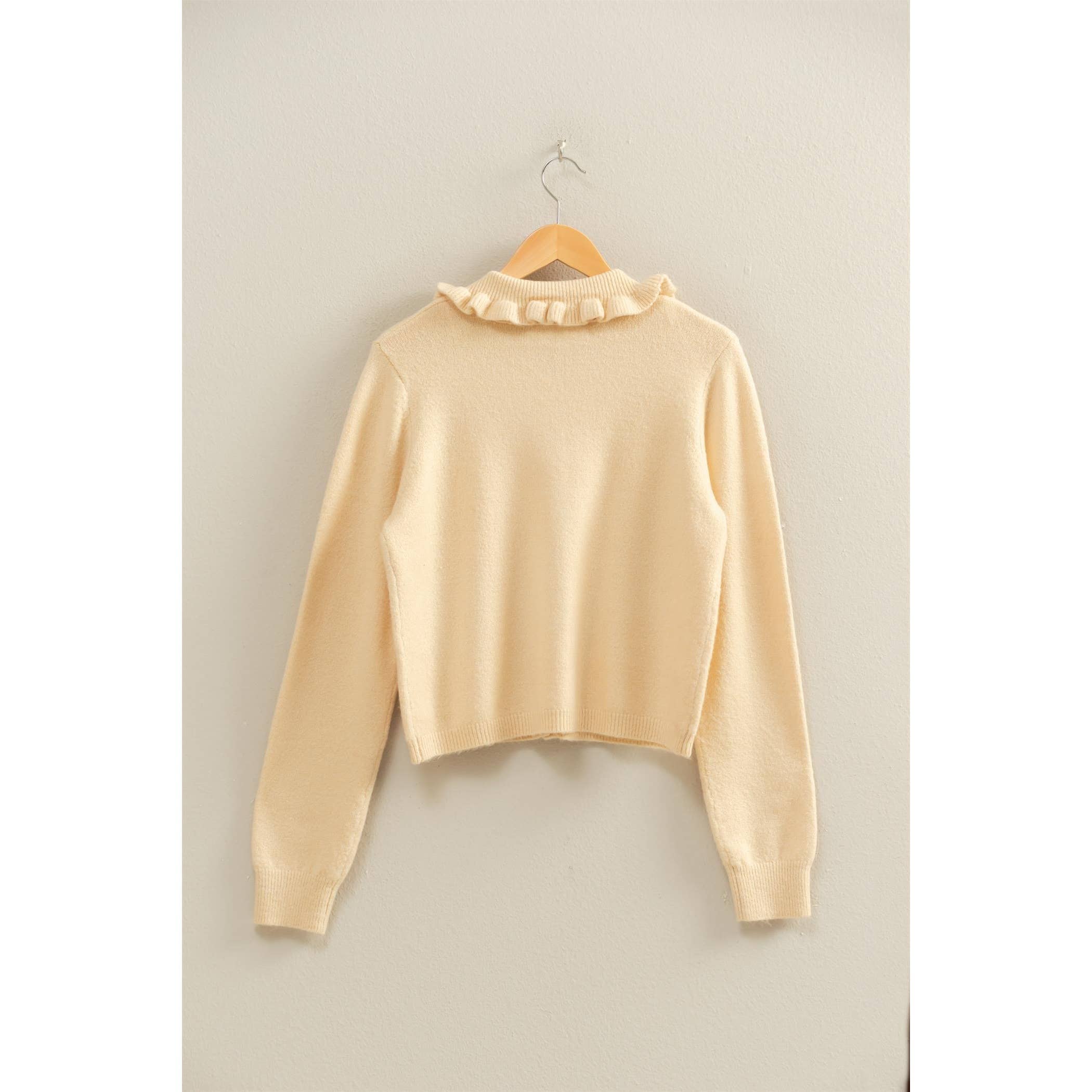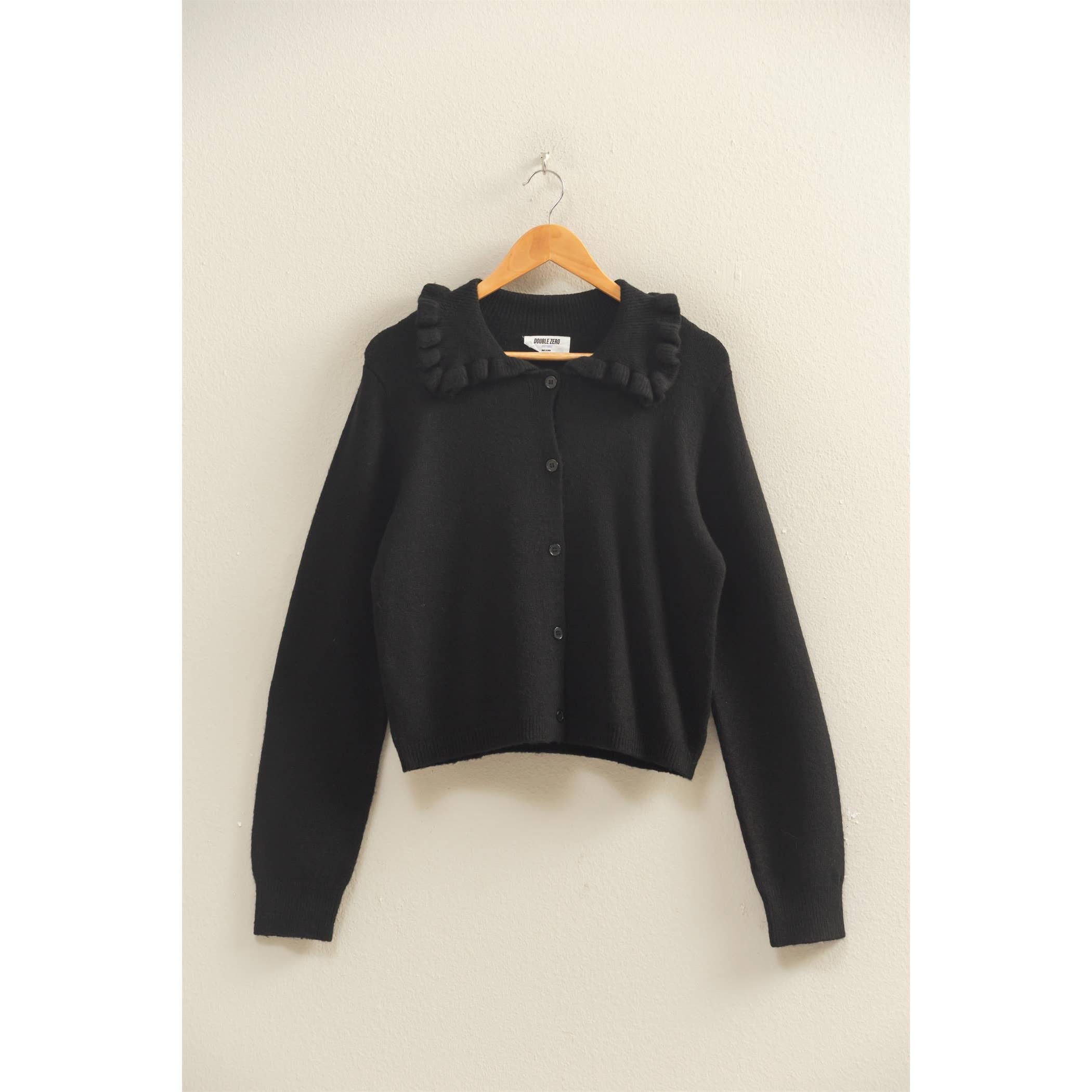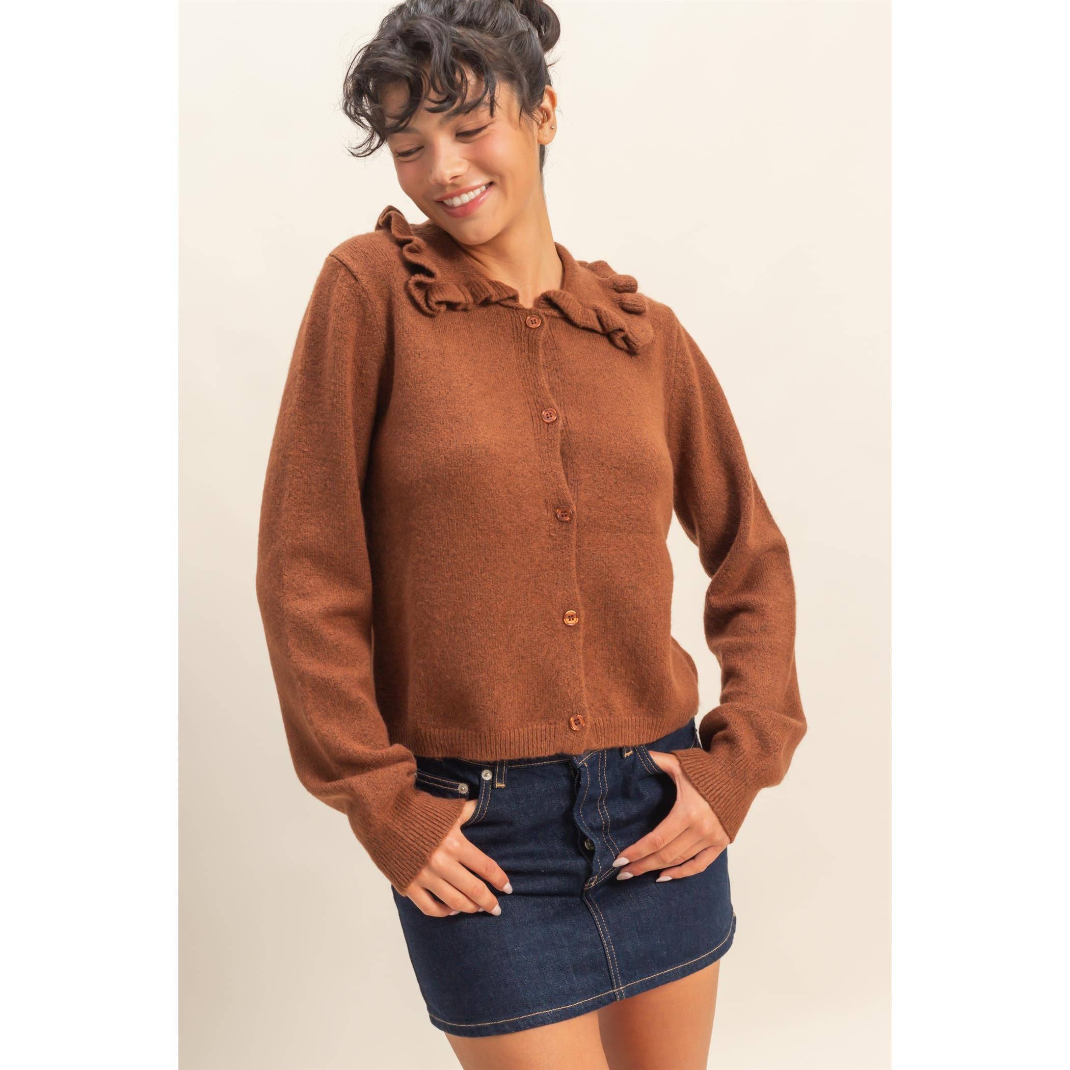 This cardigan sweater offers a luxurious feel and unique style. The beautiful ruffle collar on the front button-up and the charming frill decoration on the neckline are eye-catching. Coordinate with denim on a chilly fall day or layer over a light dress for warmth and nostalgia. Model Is 5' 7" Tall, 32" Chest, 25" Waist, 36" Hips And Wearing A Size Small