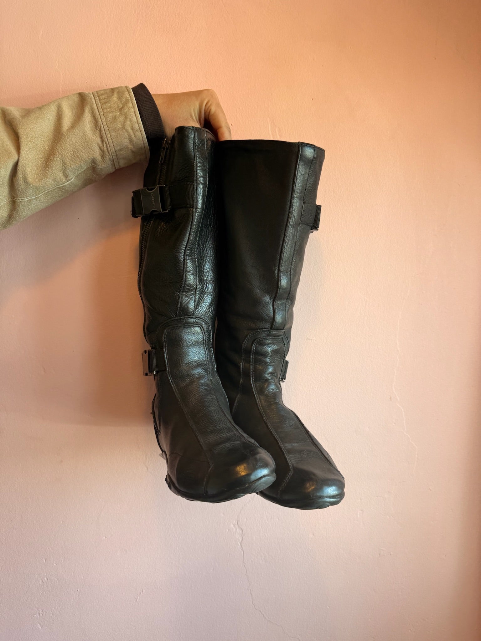 Step into the future with these striking Vintage DKNY Black Buckle Boots. Sleek black leather meets bold side buckle detailing for an edgy, futuristic vibe that bridges retro cool with a modern attitude.