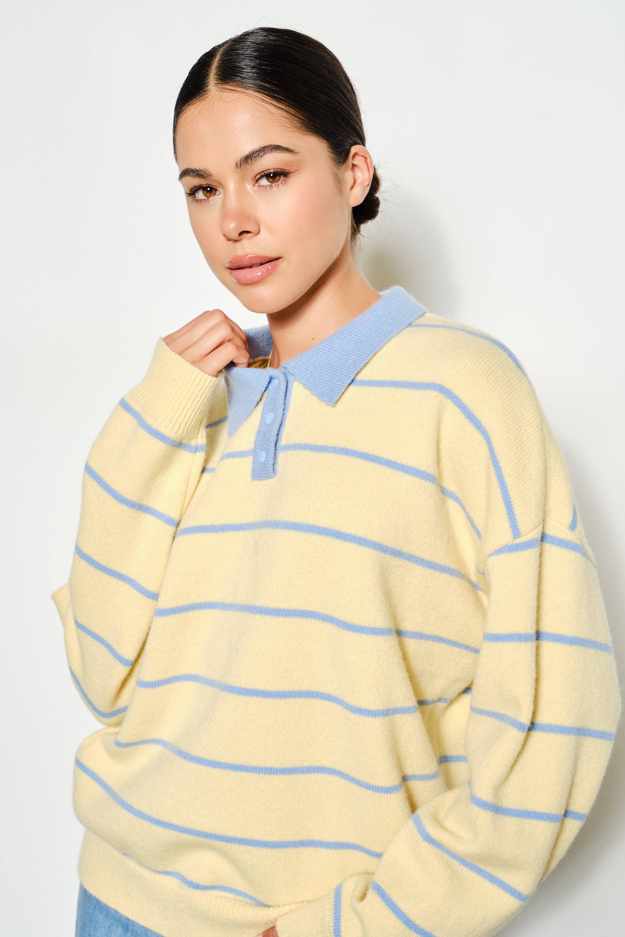 The Joanna Striped Rugby Sweater gives classic collegiate style a fresh, cozy update. This knit favorite features bold stripes, a crisp contrast collar, and a front button closure for that effortless sporty look. Designed with long sleeves and an oversized fit, it drapes beautifully for all-day comfort and a laid-back, relaxed vibe. Soft, plush, and easy to wear, this standout sweater blends timeless details with a modern, trend-forward touch that feels equal parts casual and cool. Model is 5'8" and wearing a size small. Fabric: 45% Acrylic, 29% Polyester, 26% Nylon