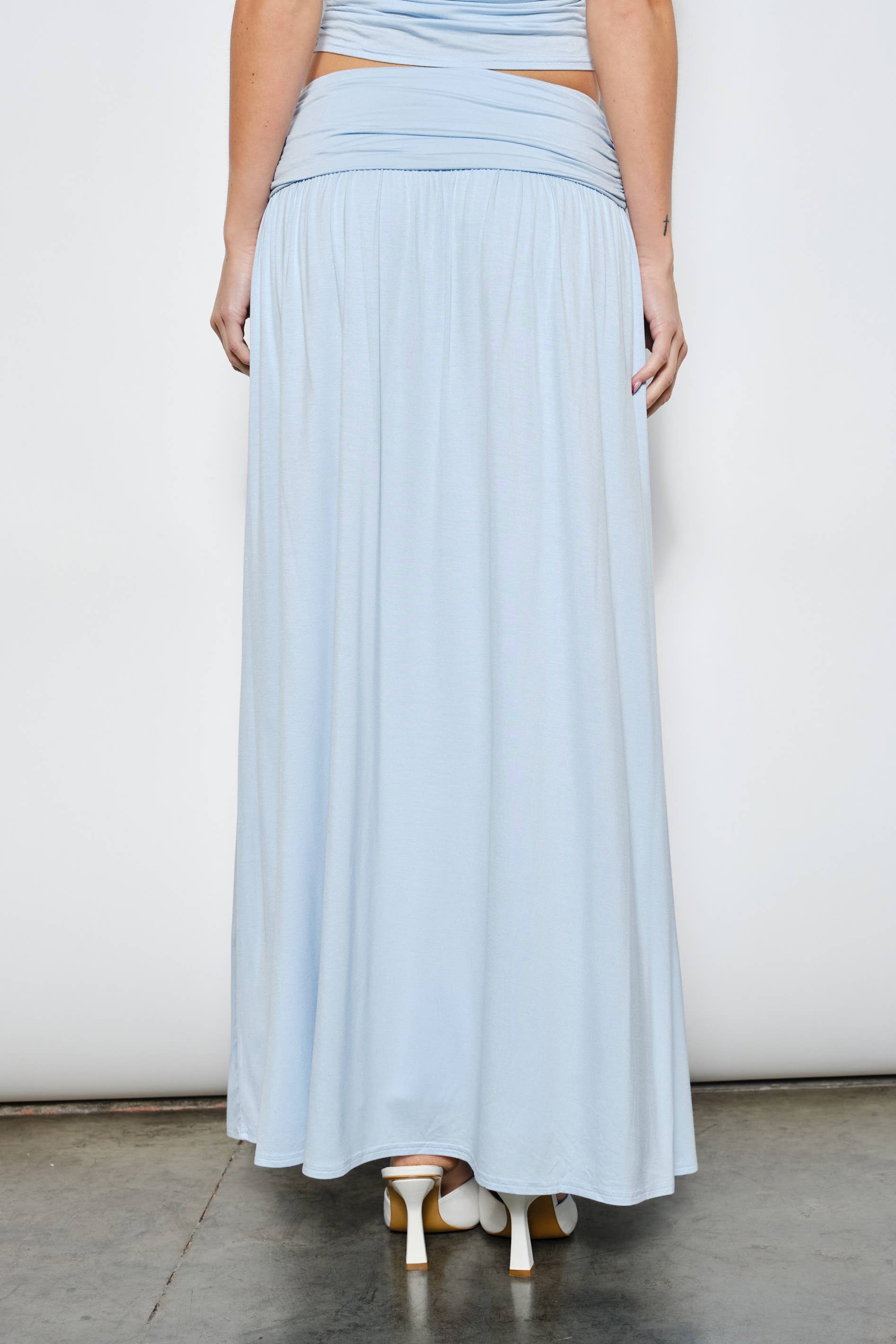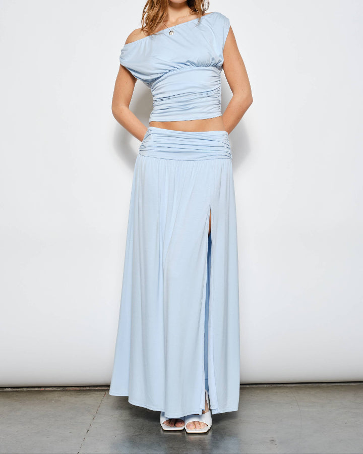 Sophisticated and effortlessly flattering, the Farrah Ruched Maxi Skirt is your go-to for chic, laid-back style. Designed with an elasticized waistband and elegant ruching at the waist, it creates a figure-hugging silhouette that’s comfortable and ultra-stylish. The side slit adds a flirty touch and easy movement, while the soft lining ensures a smooth fit. Made from a stretchy rayon blend, this piece blends comfort with everyday elegance. Pair it with the matching Farrah Top for a polished, coordinated look. Model is 5’8” and wearing a size small. Fabric: Self 95% Rayon, 5% Spandex / Lining 100% Polyester