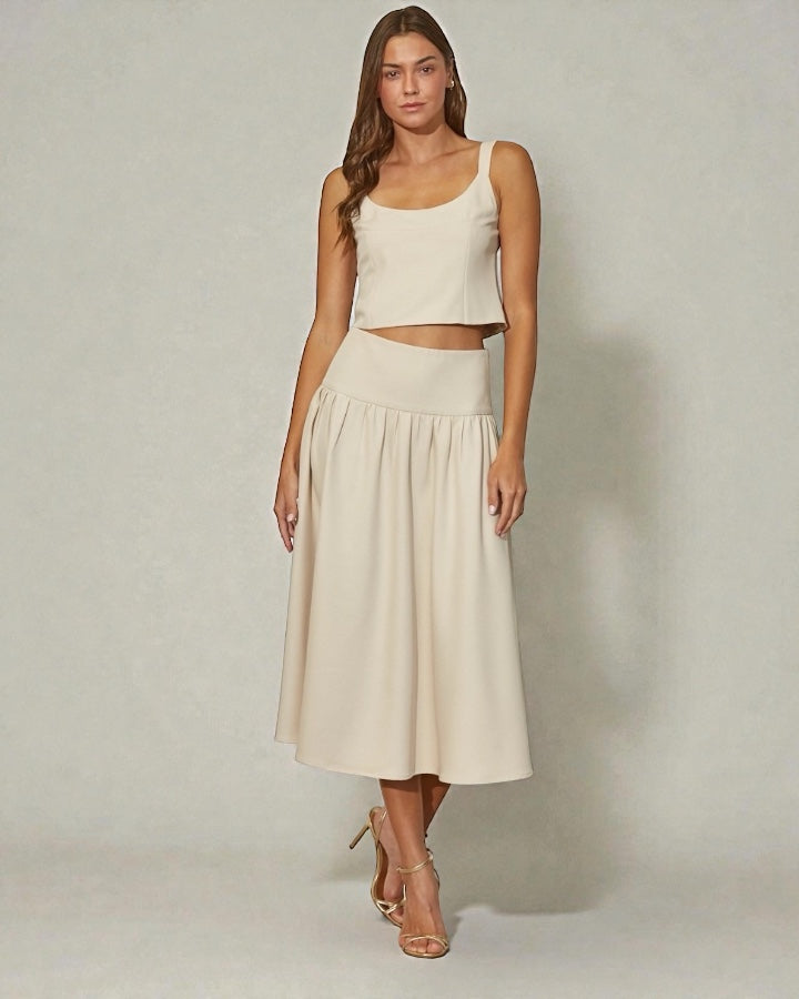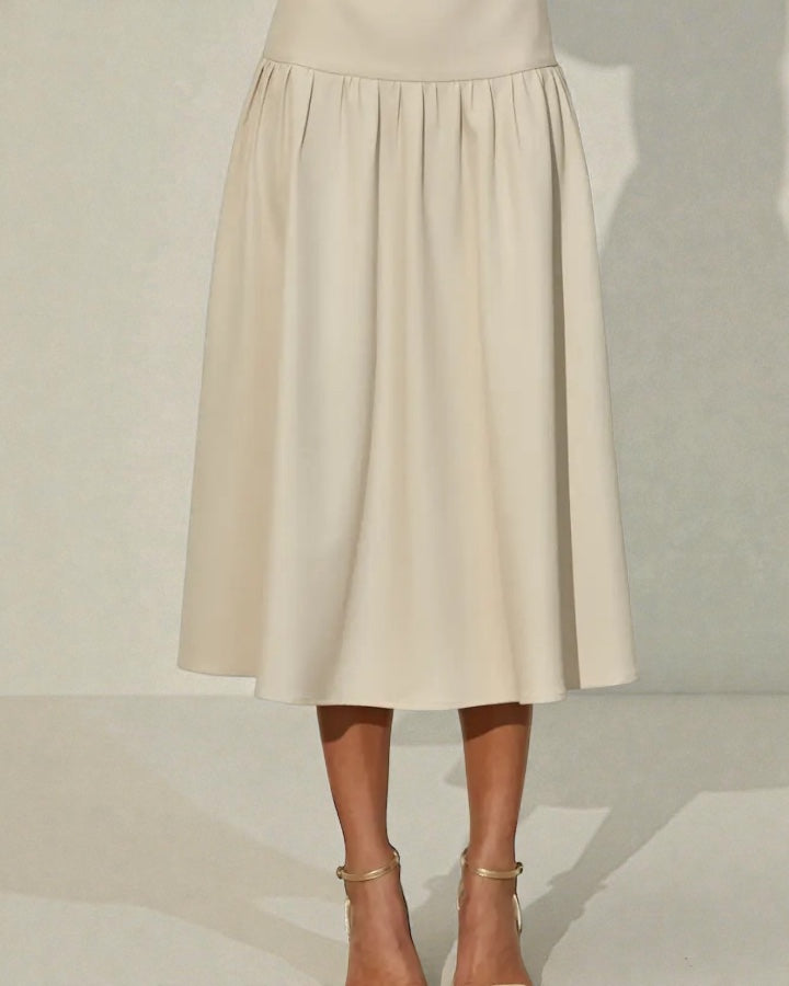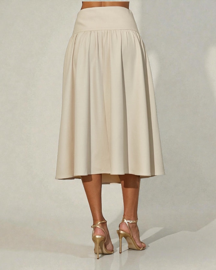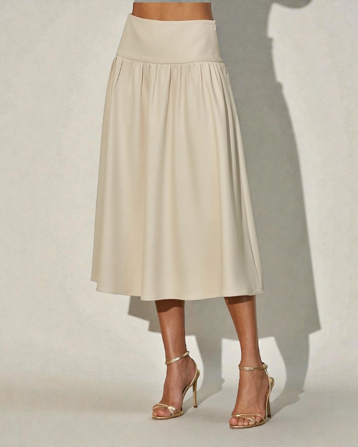 This elegant midi skirt offers a timeless silhouette with modern refinement. Designed with a flattering wide waistband and soft gathered details that flow into a graceful A-line shape. The smooth fabric drapes beautifully for effortless movement.