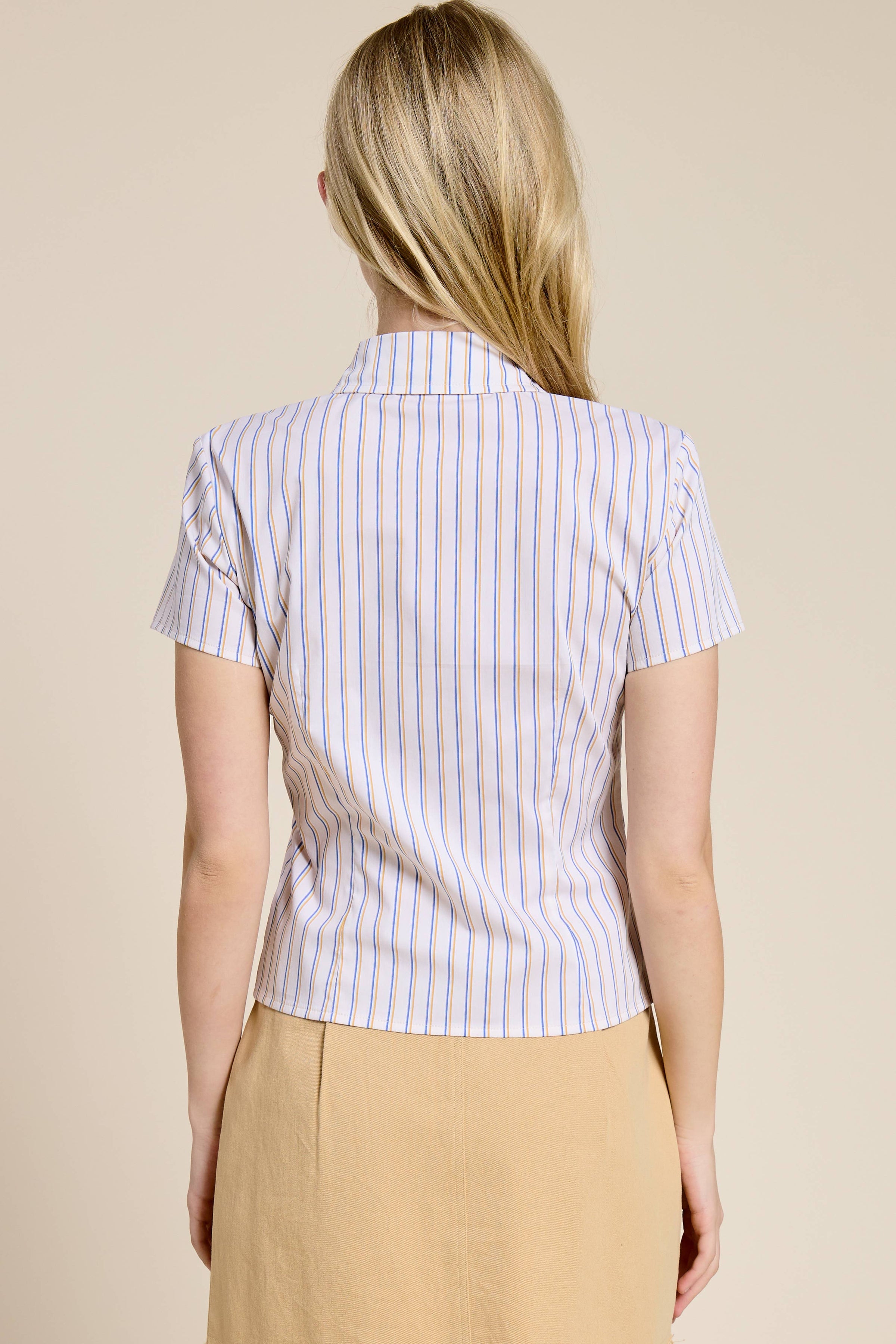 This striped short sleeve blouse features a tailored button-front design with a subtly shaped under-bust seam, creating a feminine A-line silhouette that can be worn fully buttoned or styled with a modern split-hem finish.