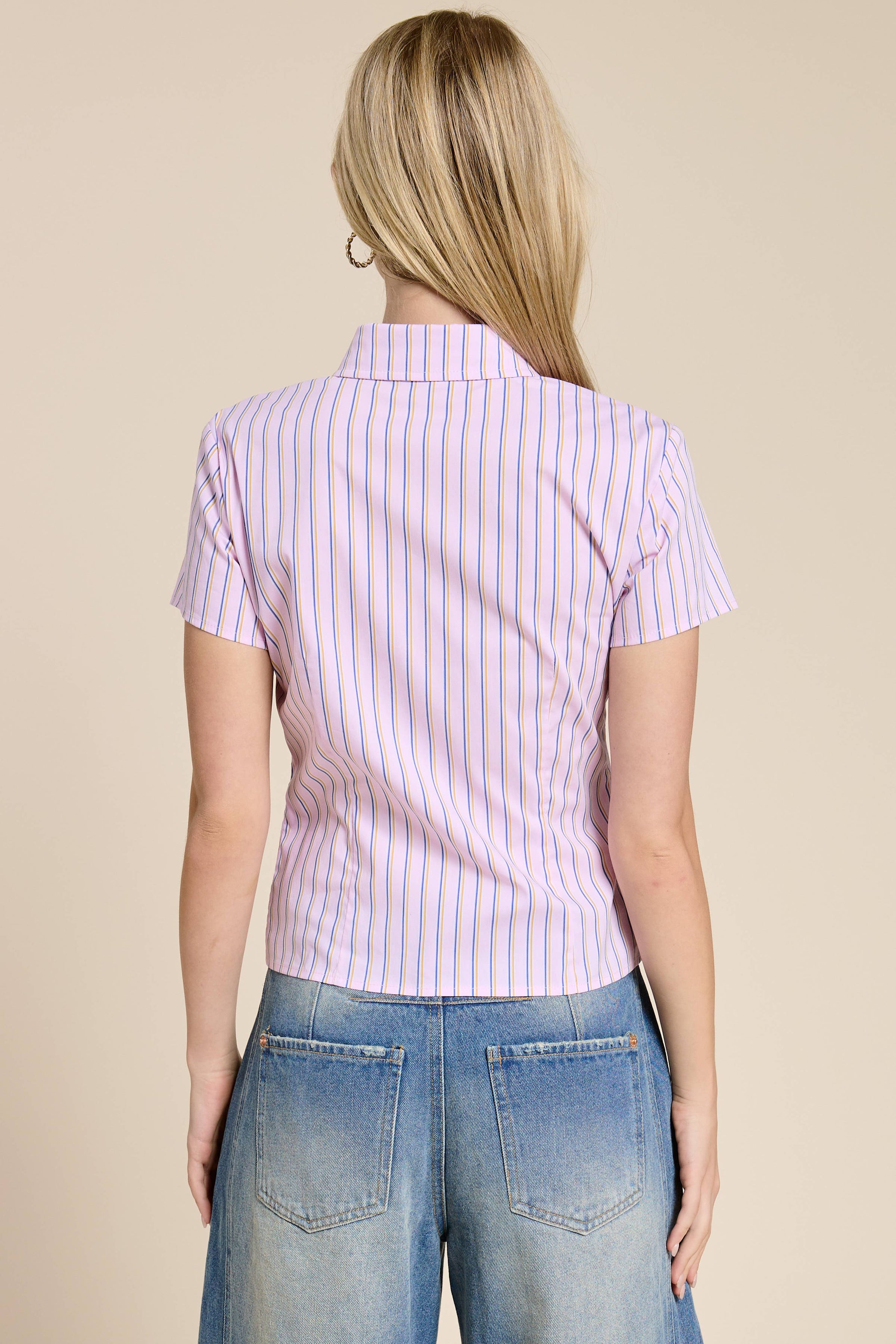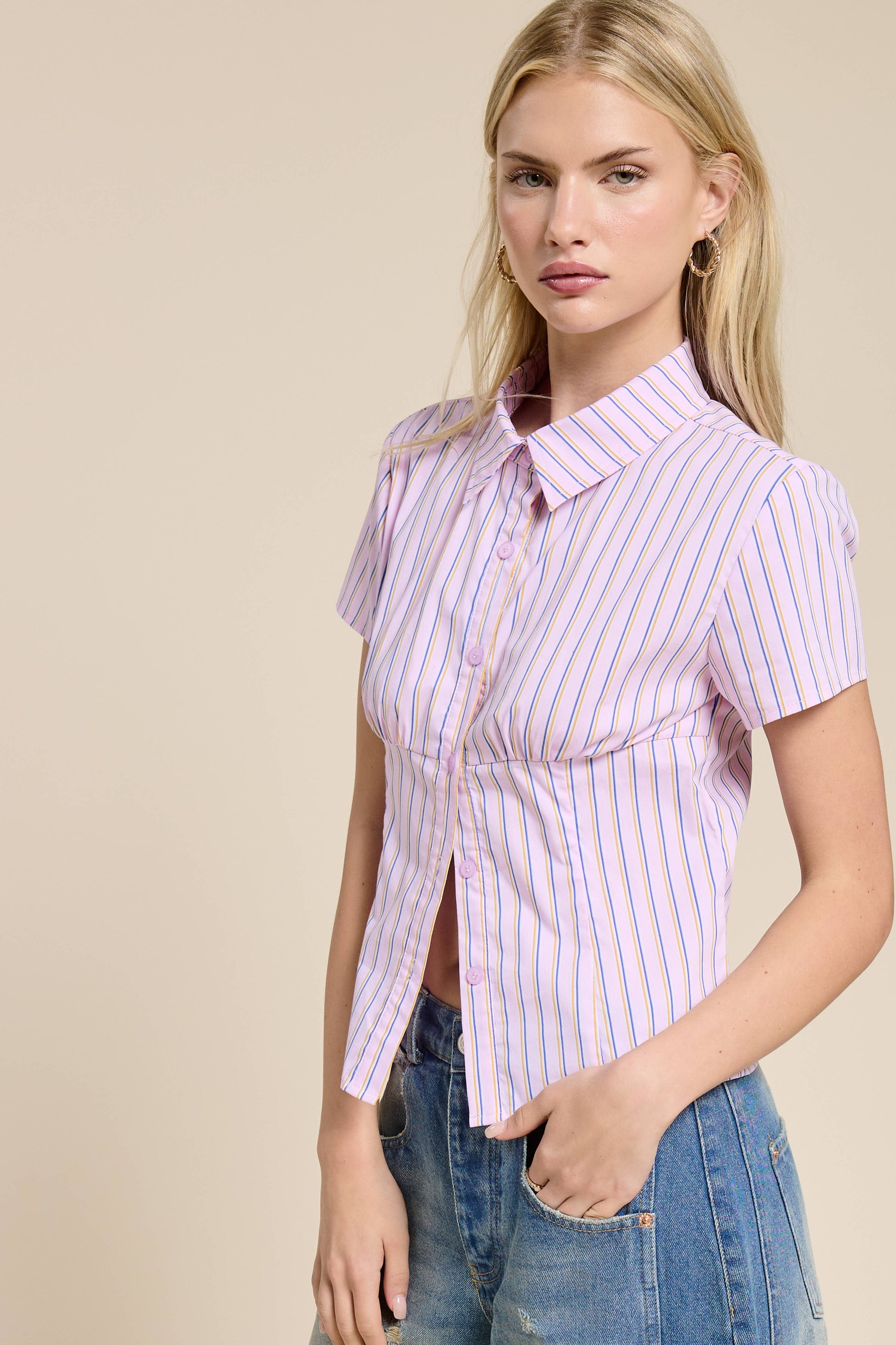 This striped short sleeve blouse features a tailored button-front design with a subtly shaped under-bust seam, creating a feminine A-line silhouette that can be worn fully buttoned or styled with a modern split-hem finish.