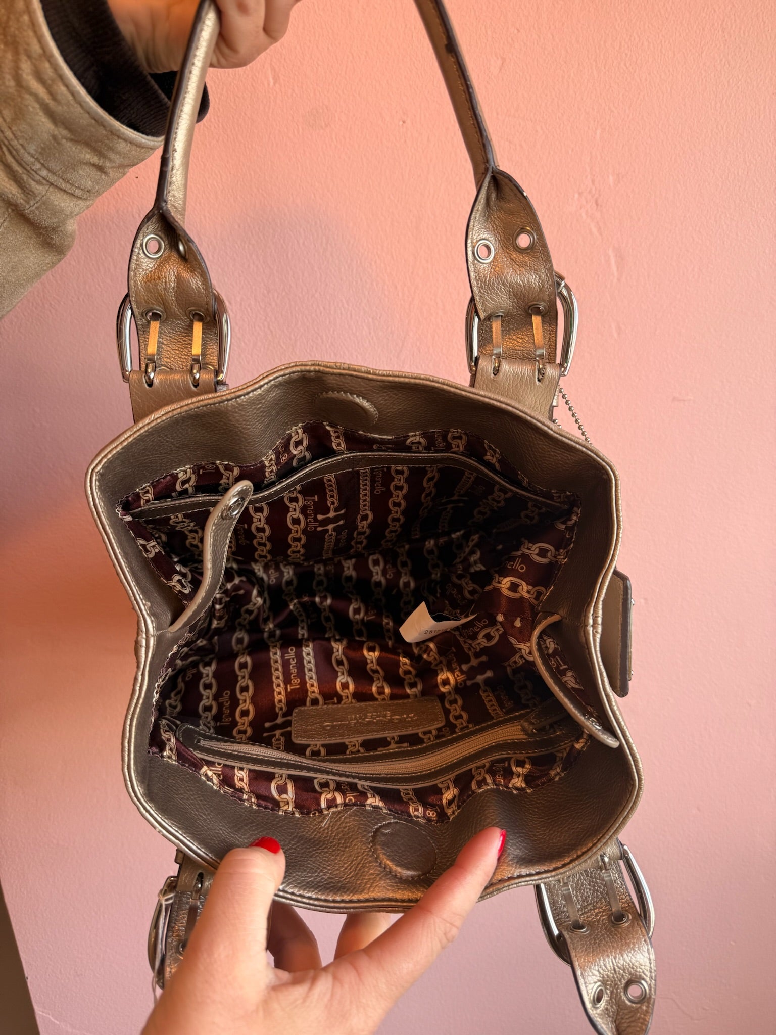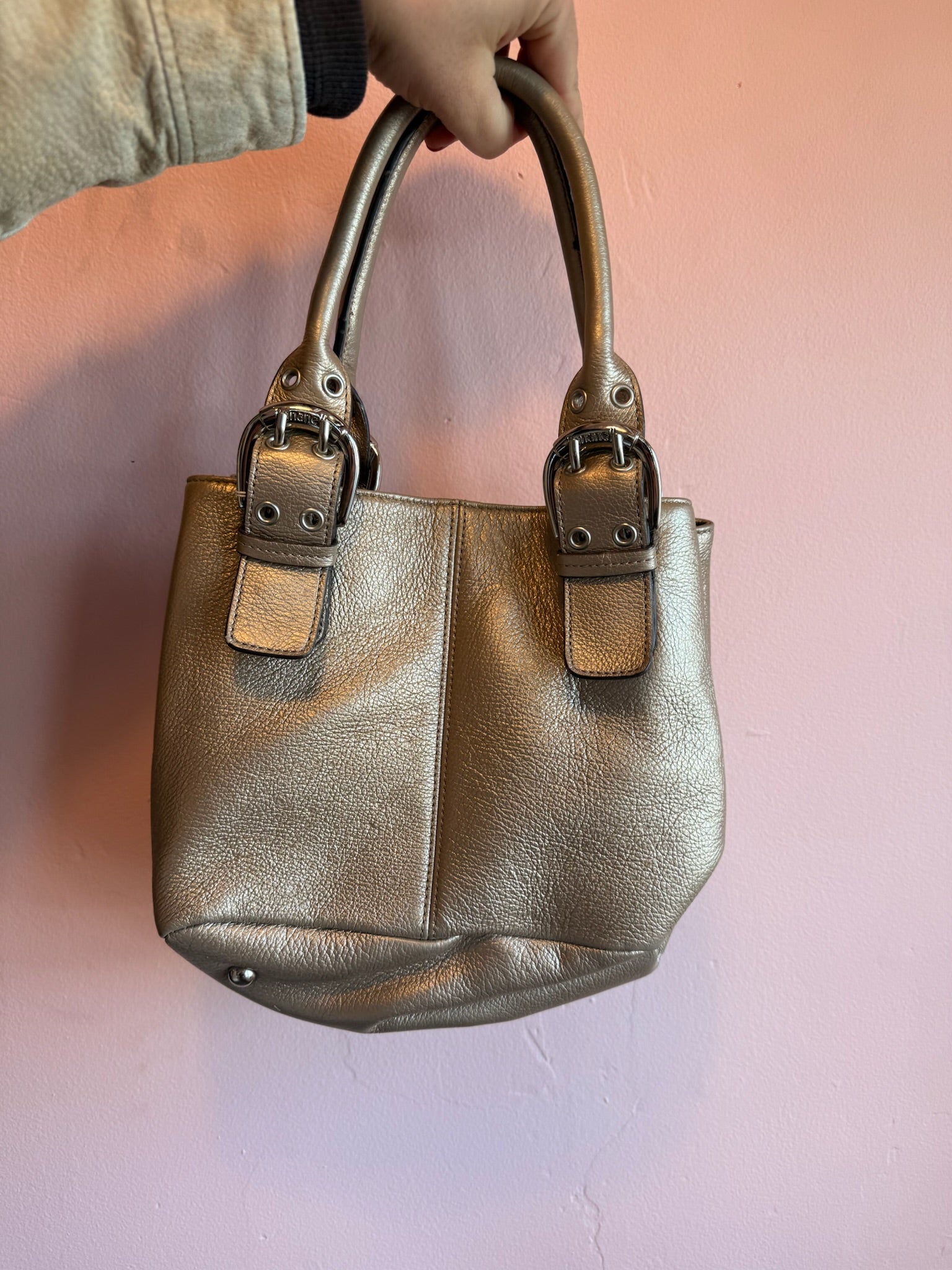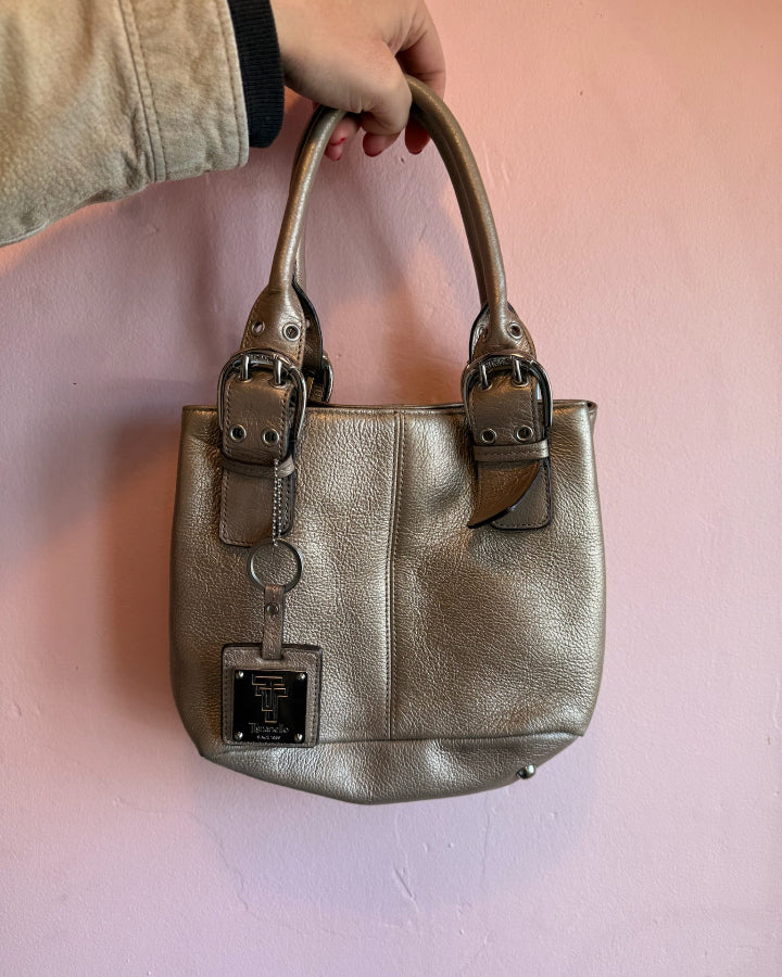 Carry a touch of retro glamour with this vintage bronze mini bag. Crafted with a warm metallic finish, it features sturdy buckle straps that add an edgy, sophisticated vibe to any outfit.