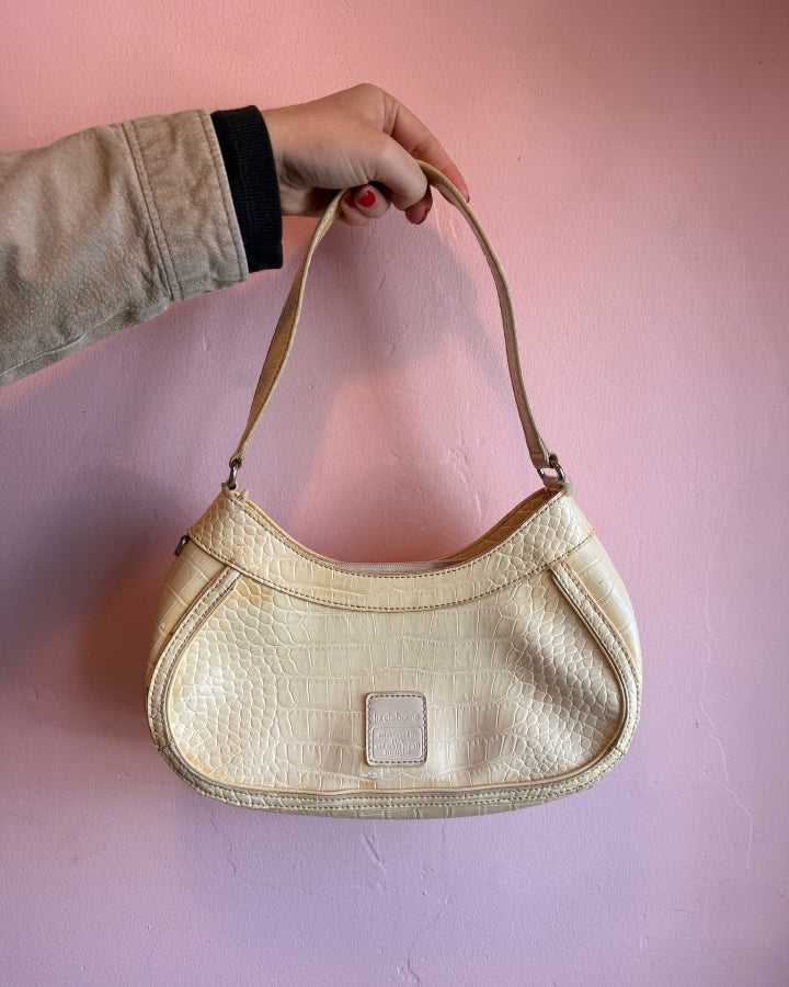 This is the perfect everyday bag for spring! It adds a nice pop of color and stands out with the alligator texture! There's little side pockets for you to store your little goodies!
