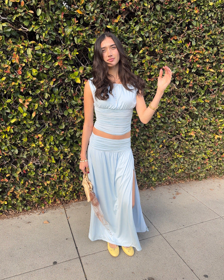 Sophisticated and effortlessly flattering, the Farrah Ruched Maxi Skirt is your go-to for chic, laid-back style. Designed with an elasticized waistband and elegant ruching at the waist, it creates a figure-hugging silhouette that’s comfortable and ultra-stylish. The side slit adds a flirty touch and easy movement, while the soft lining ensures a smooth fit. Made from a stretchy rayon blend, this piece blends comfort with everyday elegance. Pair it with the matching Farrah Top for a polished, coordinated look. Model is 5’8” and wearing a size small. Fabric: Self 95% Rayon, 5% Spandex / Lining 100% Polyester