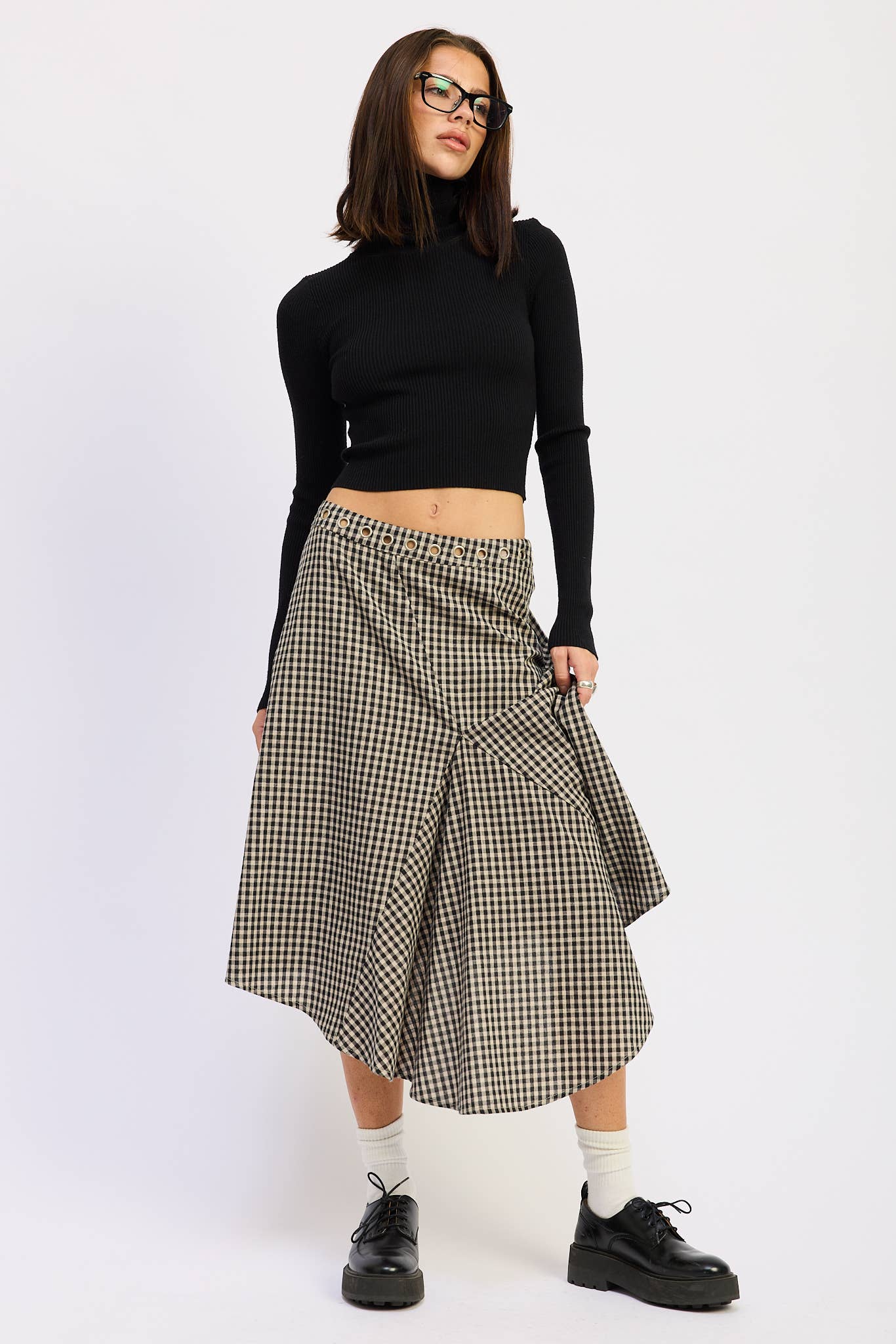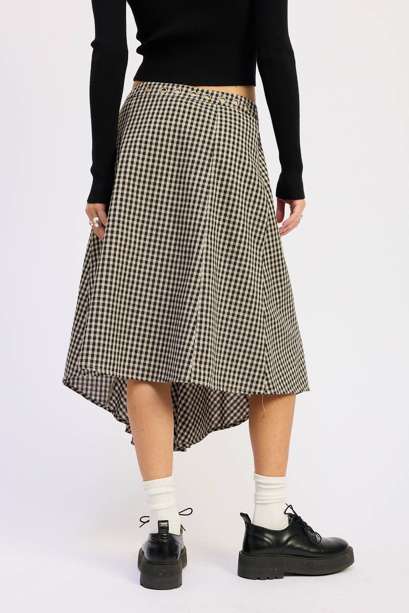 An easy favorite you’ll reach for again and again. This gingham midi skirt has a relaxed fit and just the right amount of movement, with subtle pleats and a touch of grommet detail at the waist. Pairs well with a cropped sweater, vintage tee, or your go-to boots