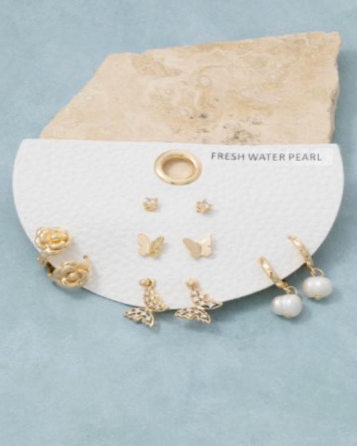 This pair of earrings features a fashionable butterflies and flowers mixed set style. Revel in the intricate design that effortlessly distinguishes this pair of earrings, making it a statement piece.