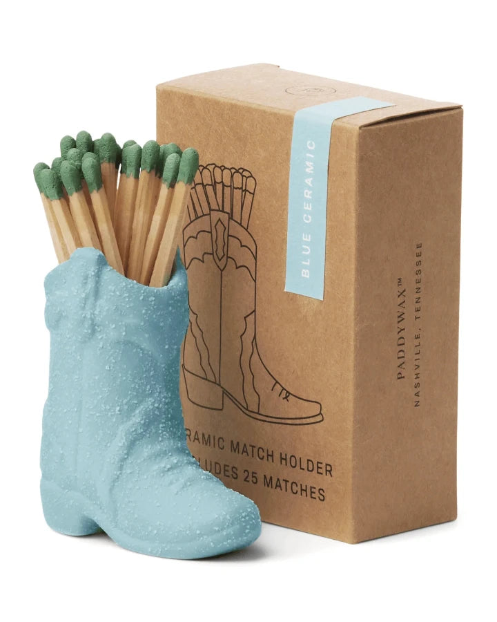 Match Tip Color: GreenBoot Color: Light BlueIncludes: 25 colorful safety matches with ceramic cowboy boot match holderDimensions: 2.75" L x 1.18" W x 3" H