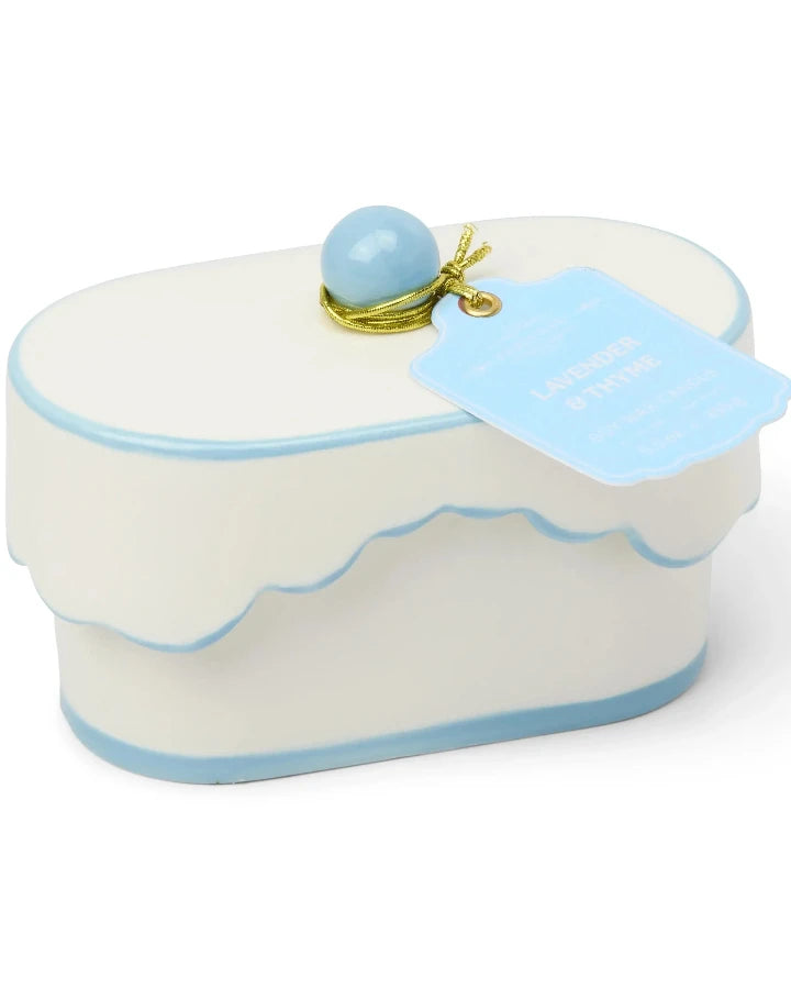 The 5.5 oz Lavender Thyme candle comes in a porcelain vessel with baby blue and white hand-painted details. Fragrance notes include lavender, white thyme, peony, soft musk, and vanilla orchid. When finished, the vessel makes an easy transition to a trinket dish or decorative accent.
