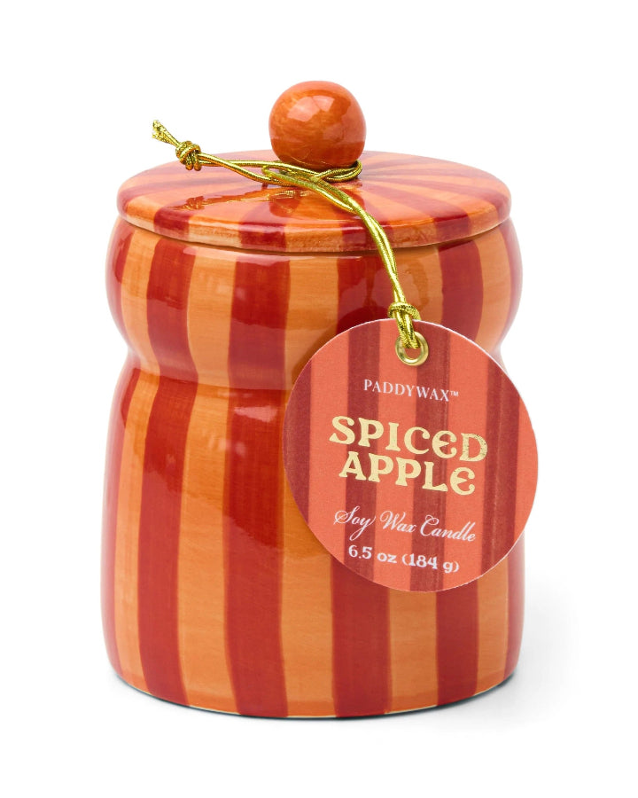 Bring home the holiday season with the Spiced Apple cabana ceramic candle. Housed in a hand-painted orange and red vessel with a matching lid, this festive candle blends crisp apple with warm spices for a cozy, nostalgic scent. Once the candle has finished, the lidded ceramic jar can be reused as a decorative container or storage piece.