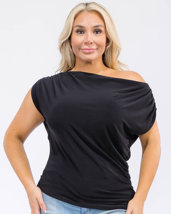 A flattering draped top with an effortless feel. Soft stretch fabric, a beautifully gathered neckline, and gentle side ruching make this an easy, polished pick