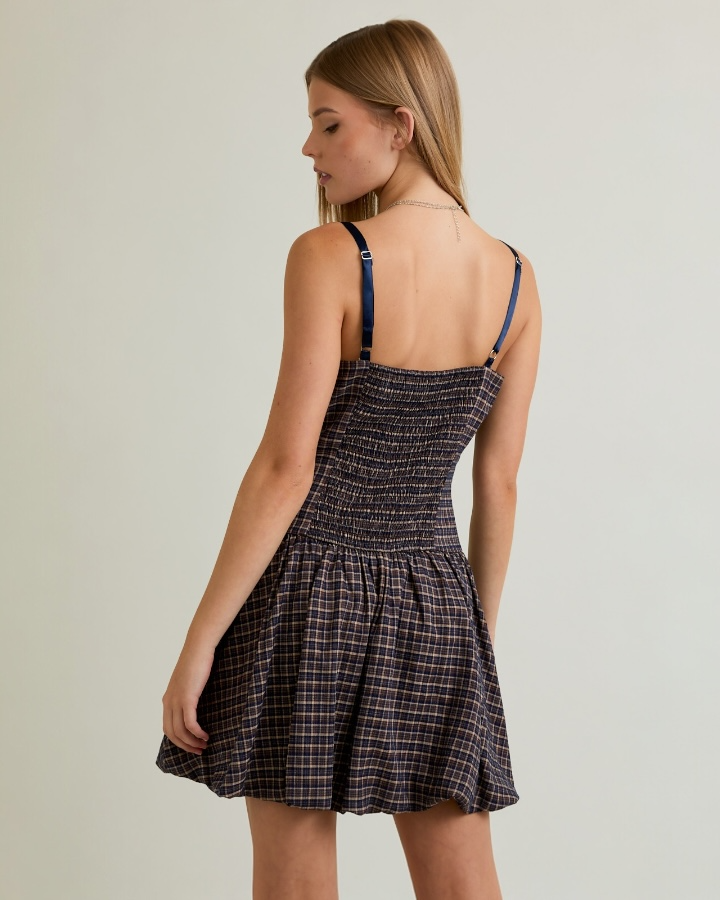 Adorable plaid mini dress with bubble skirt and satin ribbon detailing. Perfect for this warm weather when you want to dress for fall and stay comfortable.