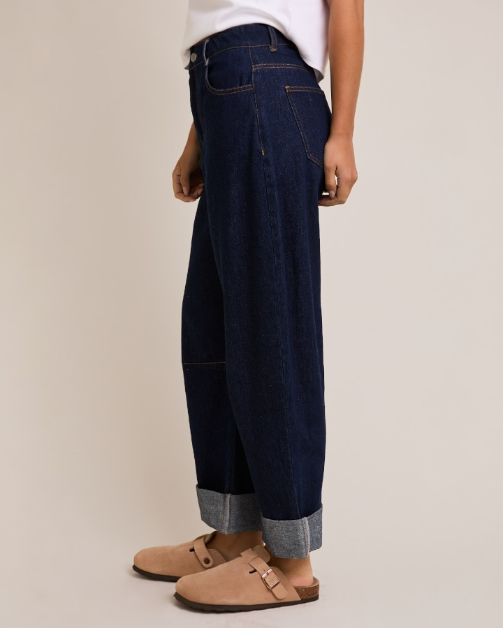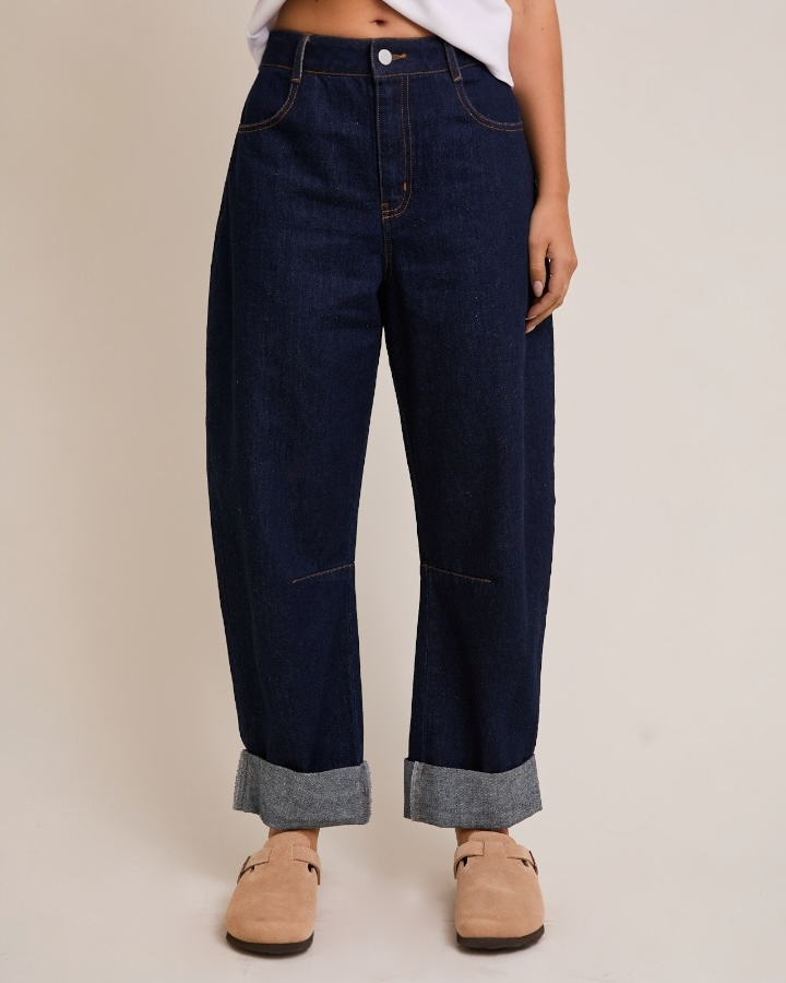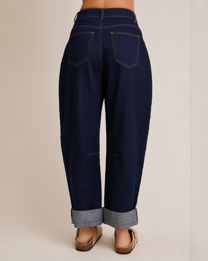 Dark denim washed denim in a barrel leg silhouette. Your new go-to fall jeans!