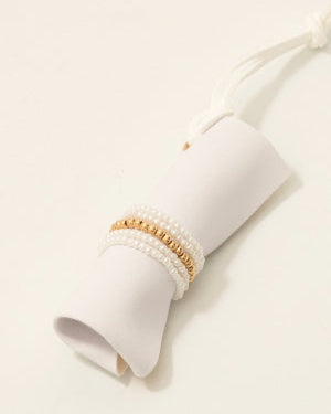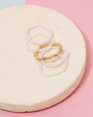 This ring set showcases a timeless pearl and metallic beaded elastic rings style. Experience a subtle blend of modernity and classic charm as this ring set effortlessly adorns your ensemble.