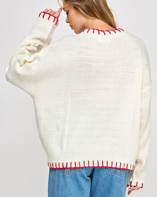 - Knit holiday pullover sweater - Big bow contrast stitches on front side - Contrast stitches on edges - Boxy fit - Model is 5' 8" 32-24-34 and wearing a S/M