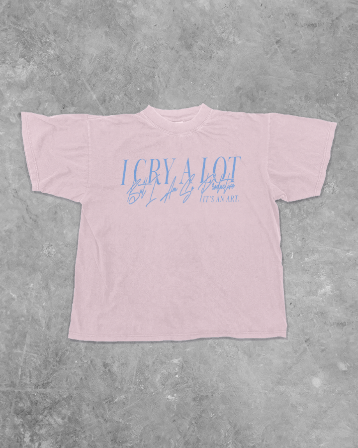 - Features "I Cry A Lot But I Am So Productive, It's An Art" across the front all in a light blue ink