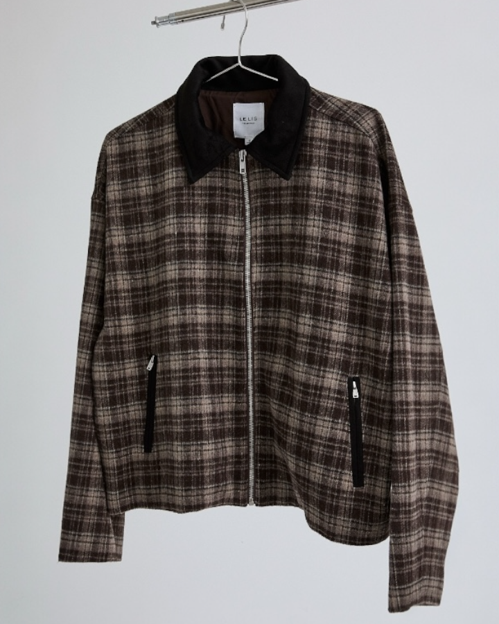 The updated work jacket! This style has a gorgeous plaid fabrication and faux suede collar with zip closure.