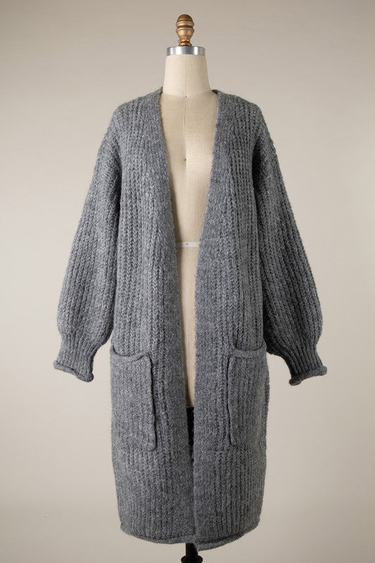 Chunky knit long cardigan with cozy pockets.