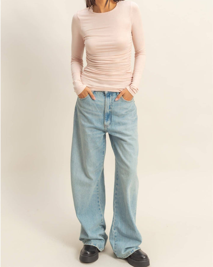 A lightweight, fitted long-sleeve in a soft blush knit with subtle ruching along the sides for an easy, flattering shape. Simple, stretchy, and comfortable, it’s the perfect everyday base layer — clean, minimal, and effortlessly wearable with denim, trousers, or under your favorite jacket.