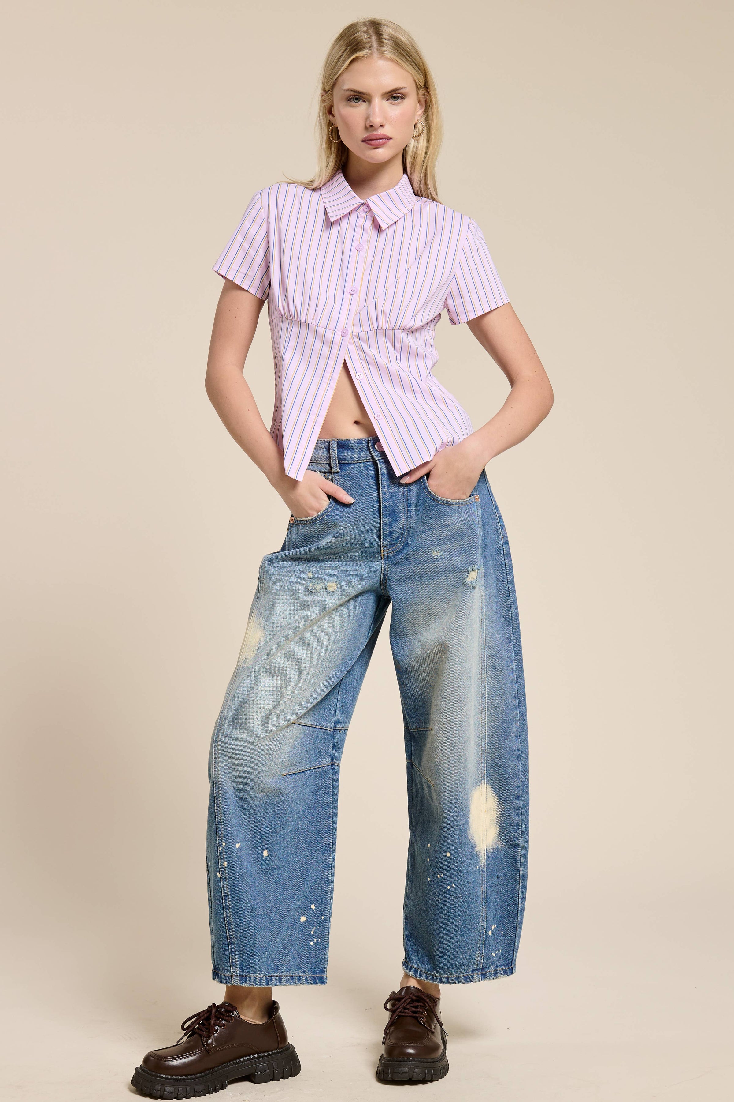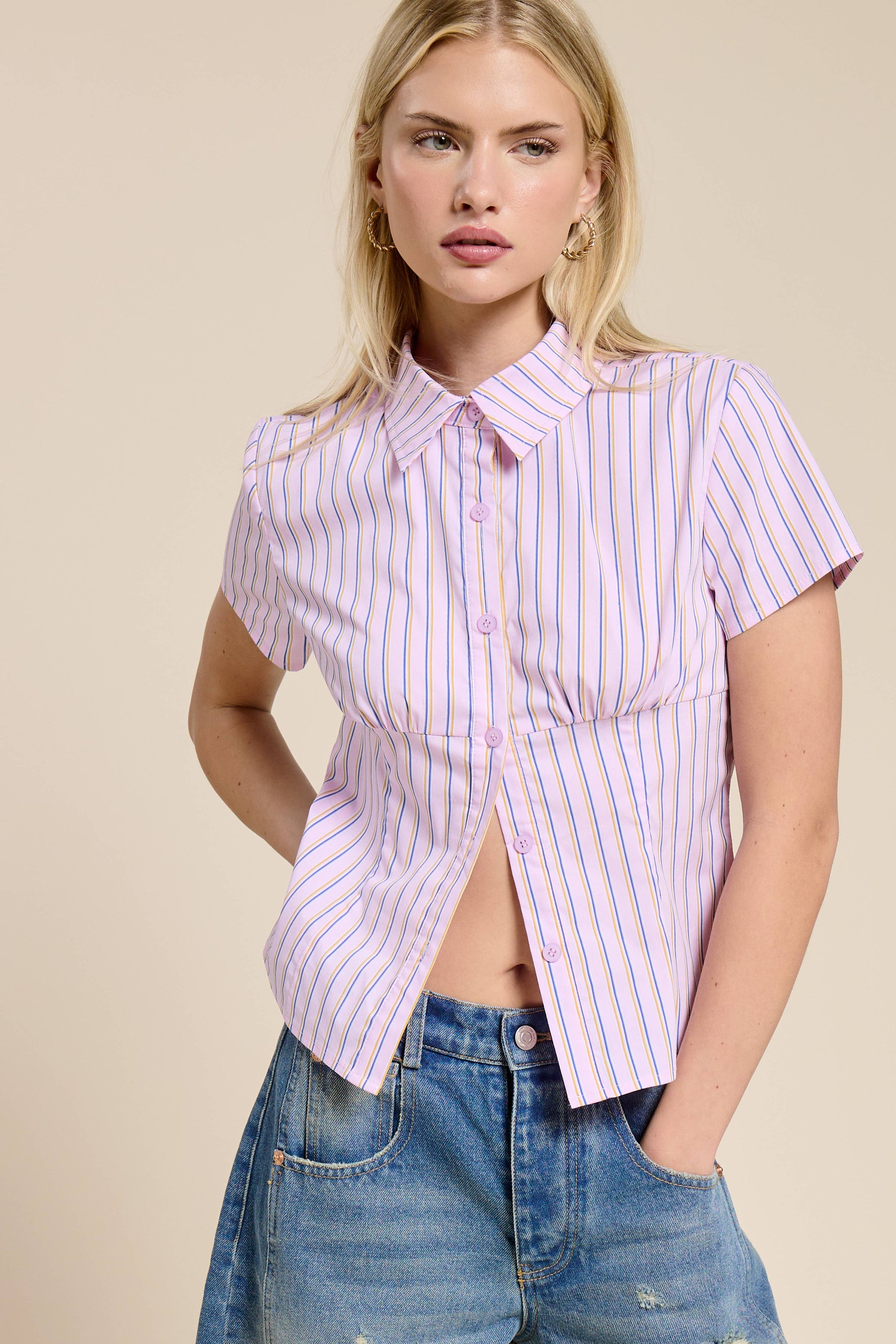 This striped short sleeve blouse features a tailored button-front design with a subtly shaped under-bust seam, creating a feminine A-line silhouette that can be worn fully buttoned or styled with a modern split-hem finish.